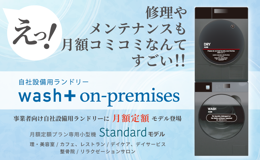 wash-plusでは、独自技術である”洗剤を使わない洗濯”を採用した、業務用の自社設備用ランドリー「wash+ on-premises」(ウォッシュプラス オンプレミス)の月額定額料金モデルの販売を開始しました 。